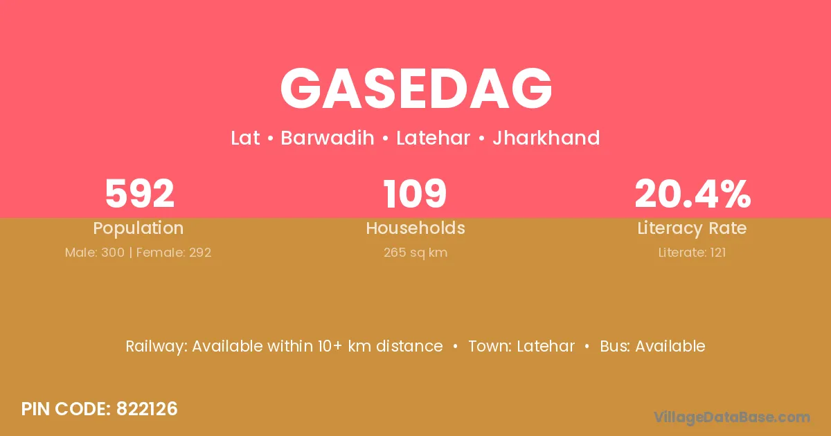 The literacy rate of Gasedag village is 20.44%. Male literacy stands at 25.33% and female literacy at 15.41%.
