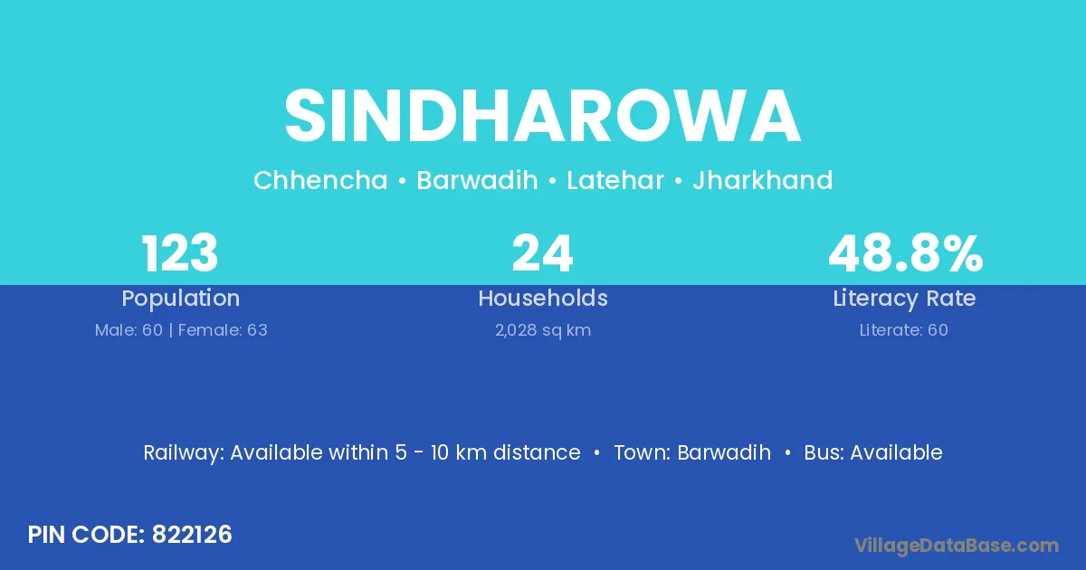 Sindharowa village has a total population of 123 people, of which 60 are males and 63 are females.