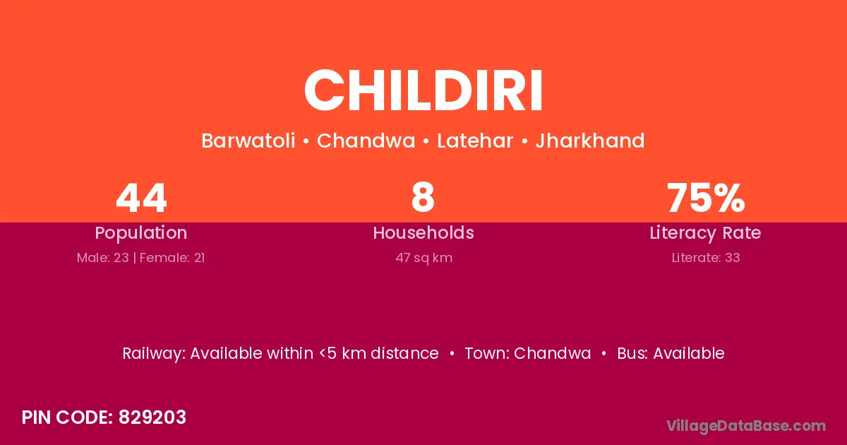 Childiri village has a total population of 44 people, of which 23 are males and 21 are females.