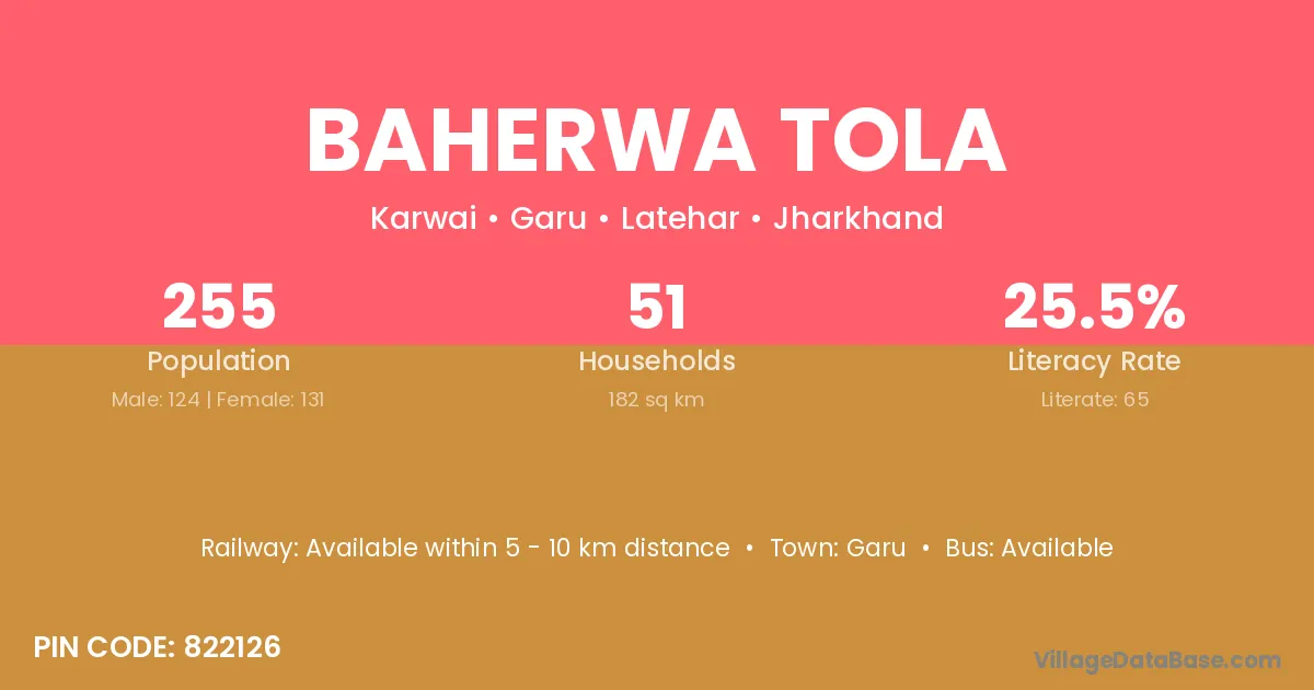 Baherwa Tola village has a total population of 255 people, of which 124 are males and 131 are females.