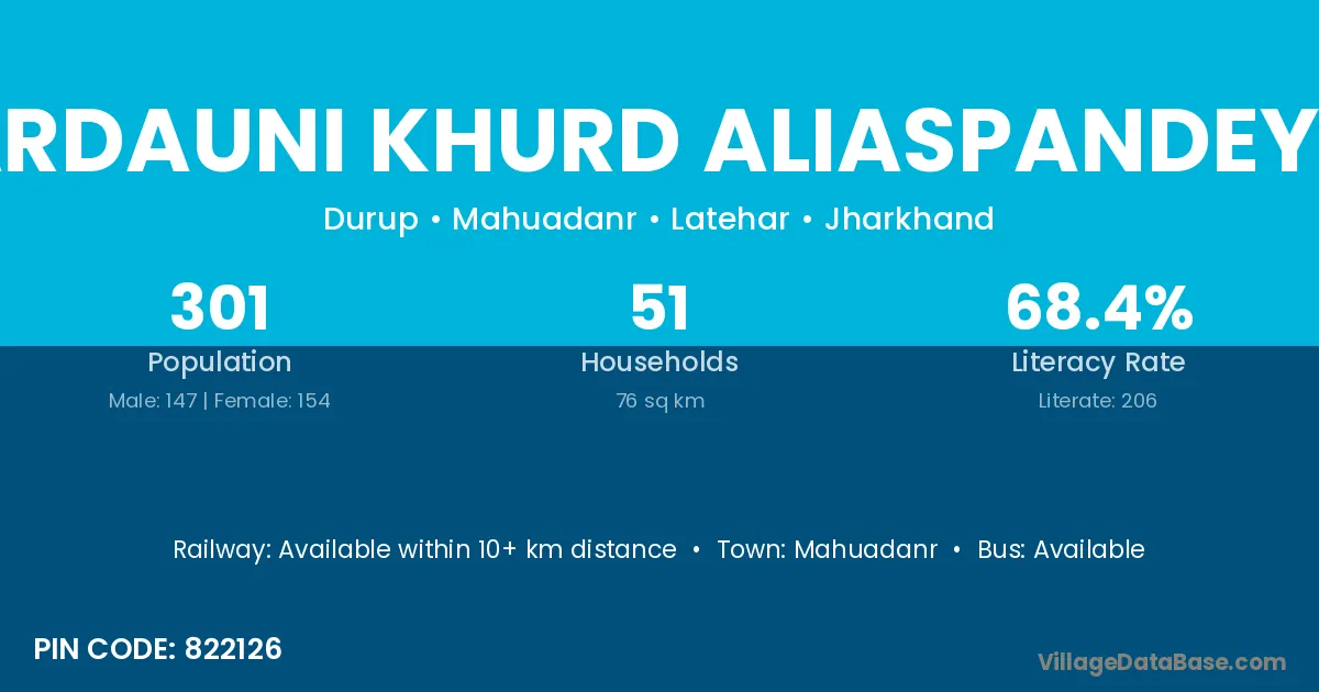 Bardauni Khurd Aliaspandeyto village has a total population of 301 people, of which 147 are males and 154 are females.