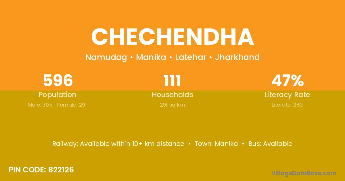 Chechendha village has a total population of 596 people, of which 305 are males and 291 are females.