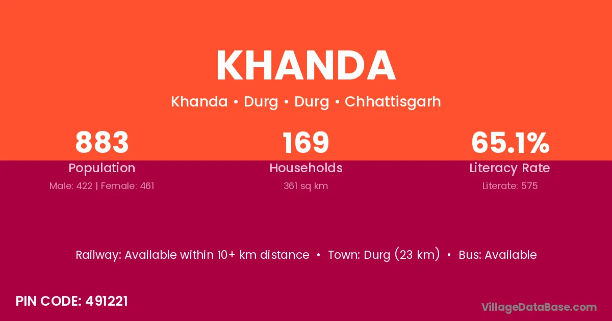 The literacy rate of Khanda village is 54.57%. Male literacy stands at 67.25% and female literacy at 41.85%.