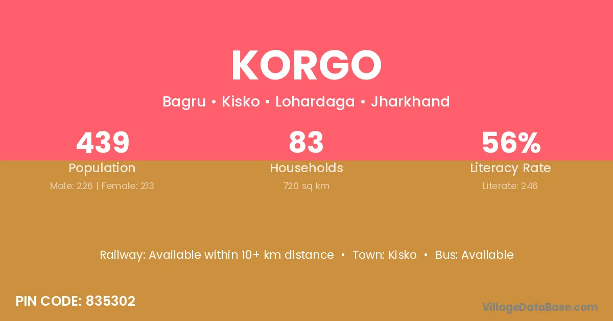 Korgo village has a total population of 439 people, of which 226 are males and 213 are females.