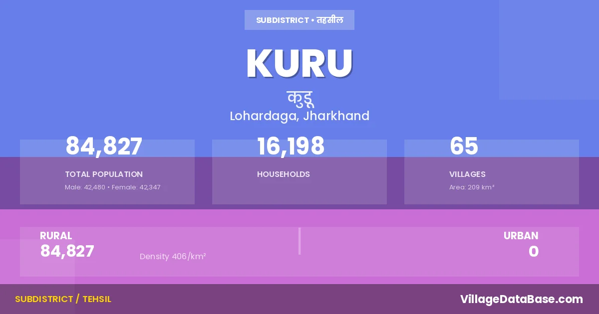 Kuru is a town and Subdivision in the Lohardaga district of the Jharkhand. In India, a Subdivision is a subdivision of a district responsible for the administration and revenue collection of a specific area within the district. Subdivisions play a crucial role in the local governance structure, contributing significantly to the development and administration of their communities.