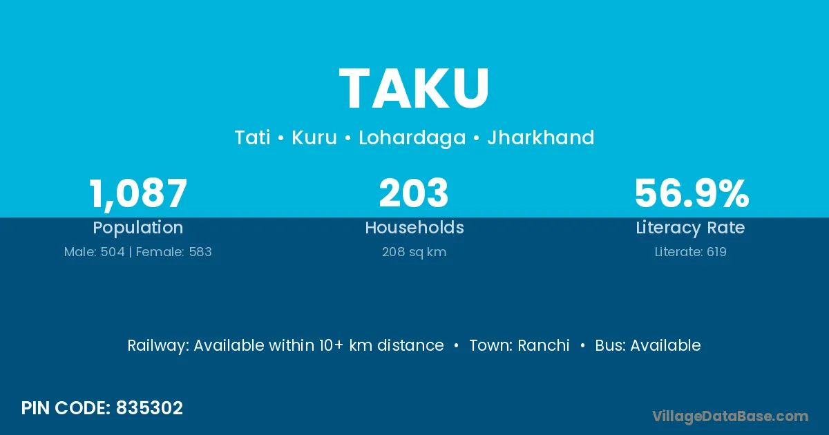 Taku village has a total population of 1,087 people, of which 504 are males and 583 are females.