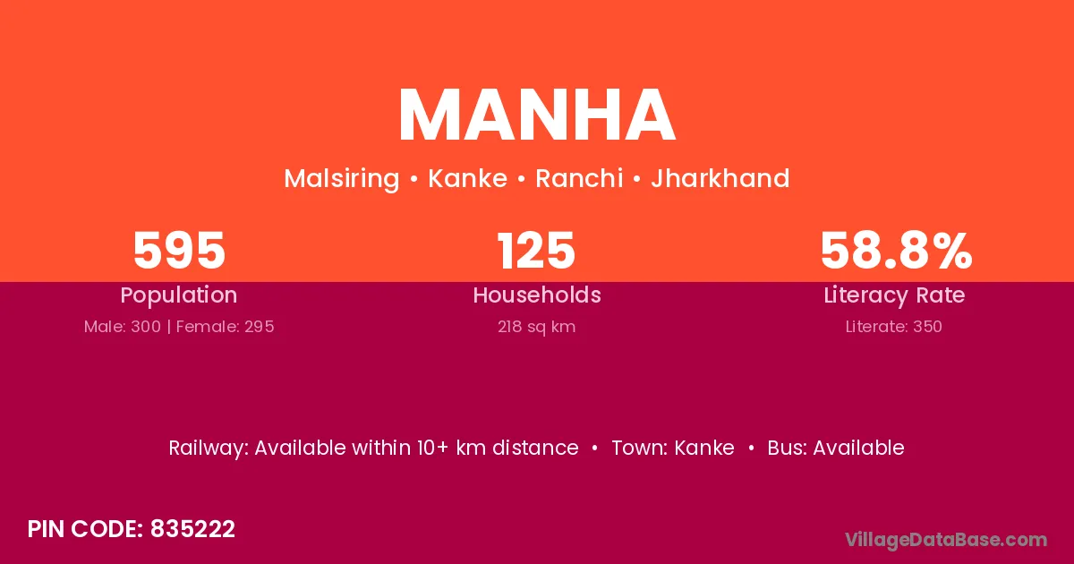 According to Census 2011 information, the village code of Manha village is 835302.