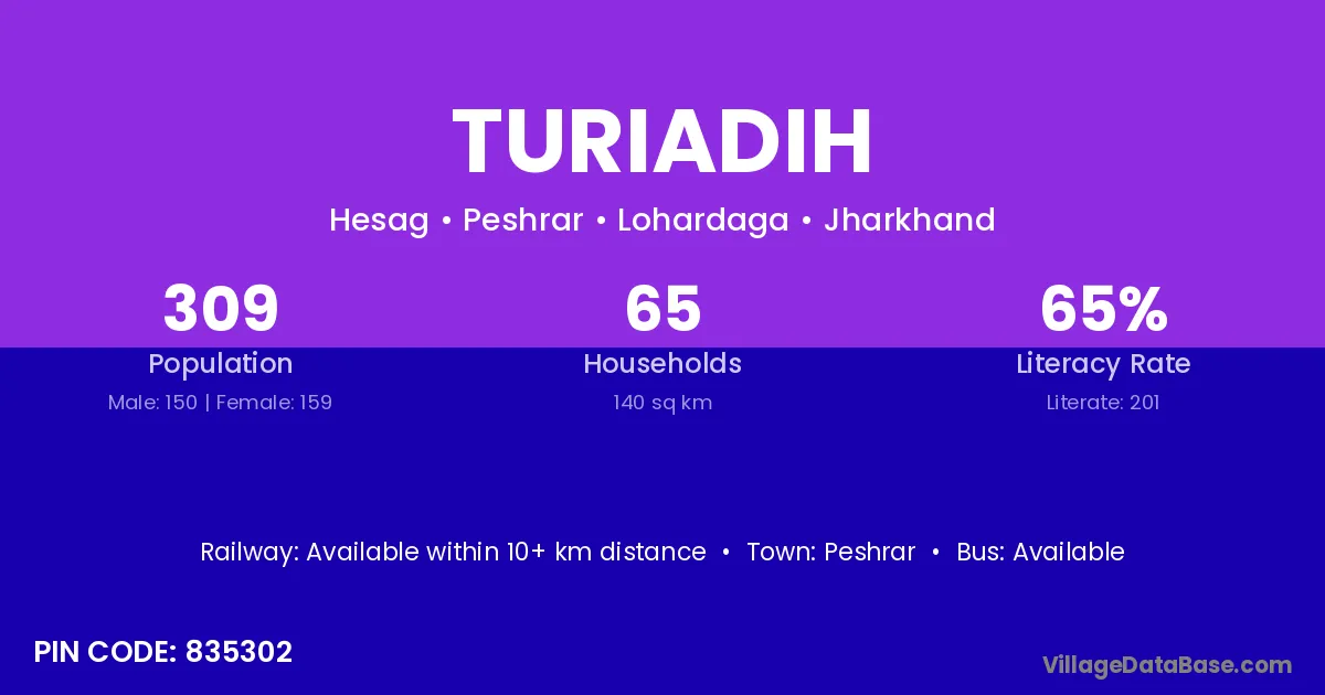 The literacy rate of Turiadih village is 65.05%. Male literacy stands at 76.67% and female literacy at 54.09%.