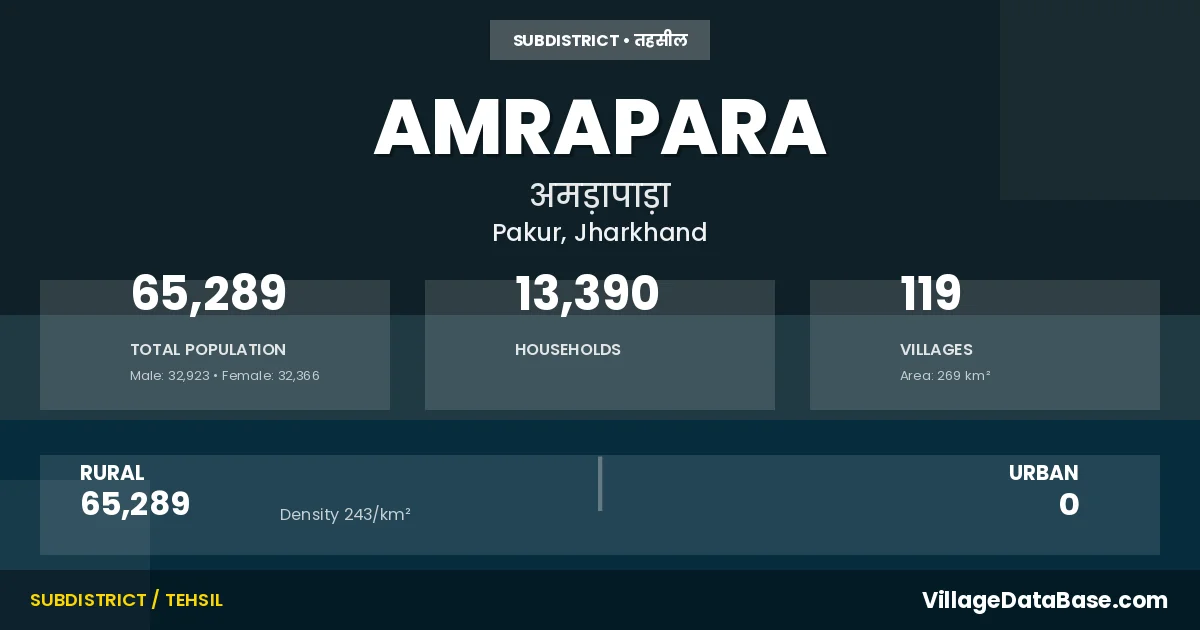 According to the 2011 census The total area of Amrapara Subdivision is 269 km², with a population of 65289 people. The population density is 243 inhabitants per square kilometre, and there are approximately 13390 houses in the sub district.