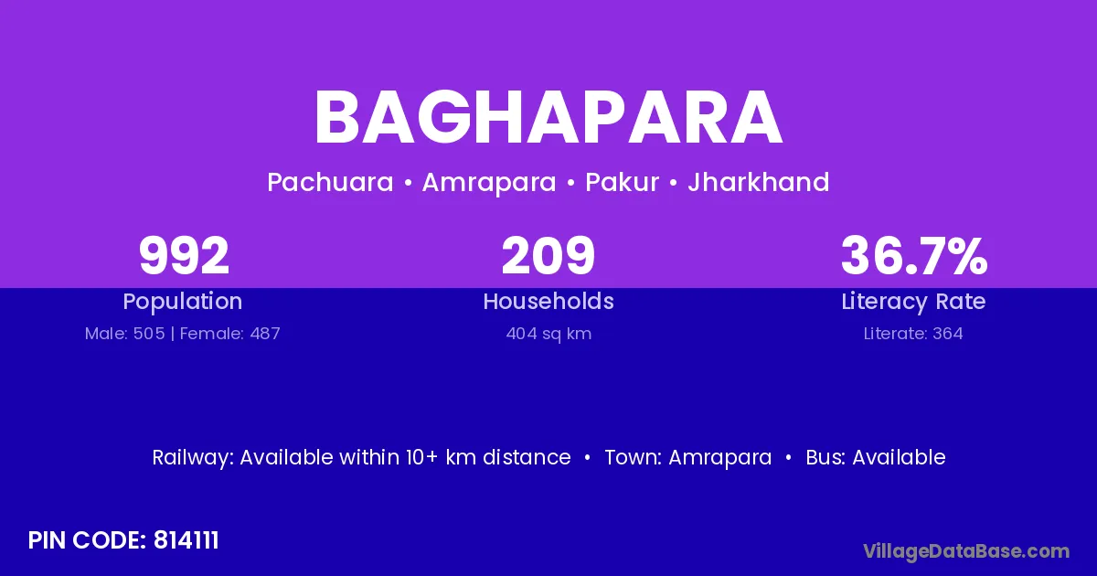 Baghapara village has a total population of 992 people, of which 505 are males and 487 are females.