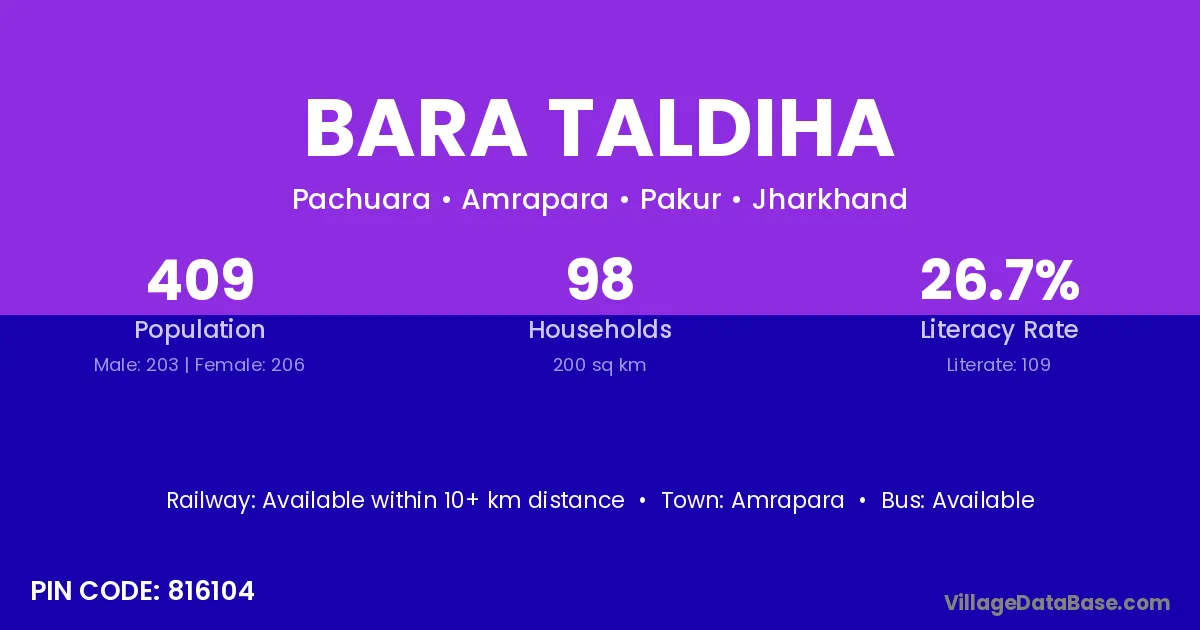 Bara Taldiha village has a total population of 409 people, of which 203 are males and 206 are females.