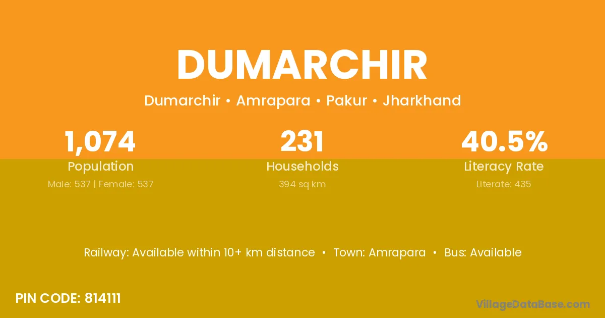 Dumarchir village has a total population of 1,074 people, of which 537 are males and 537 are females.