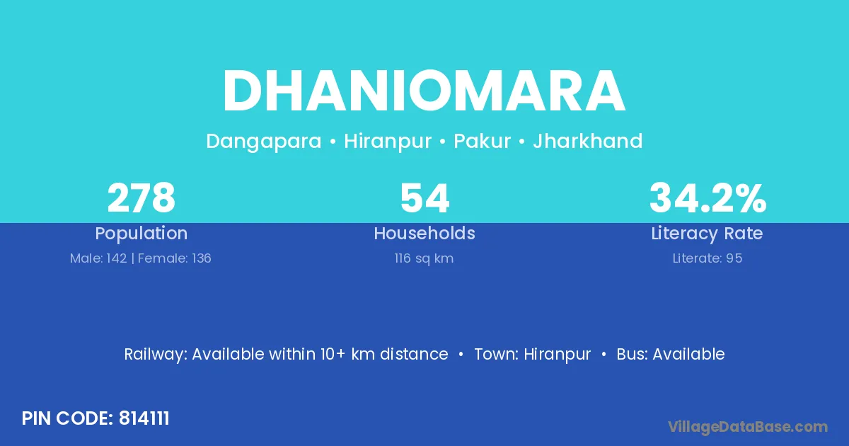 Dhaniomara village has a total population of 278 people, of which 142 are males and 136 are females.