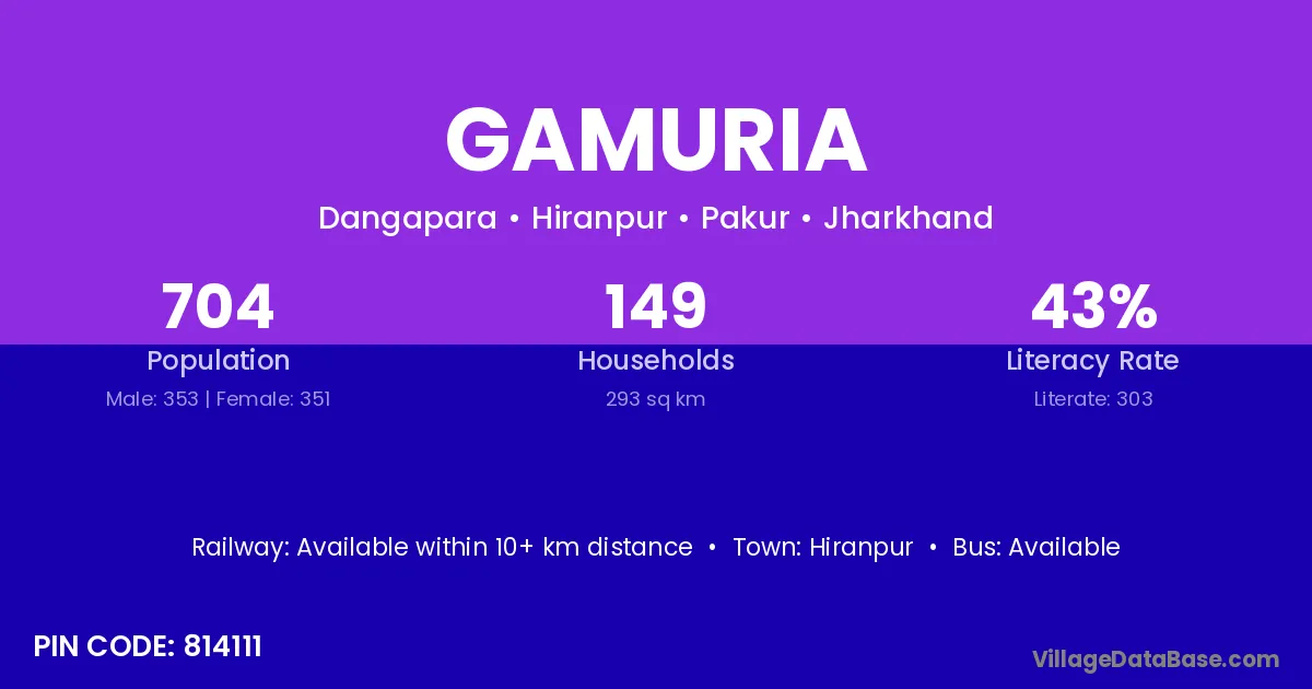 Gamuria village has a total population of 704 people, of which 353 are males and 351 are females.