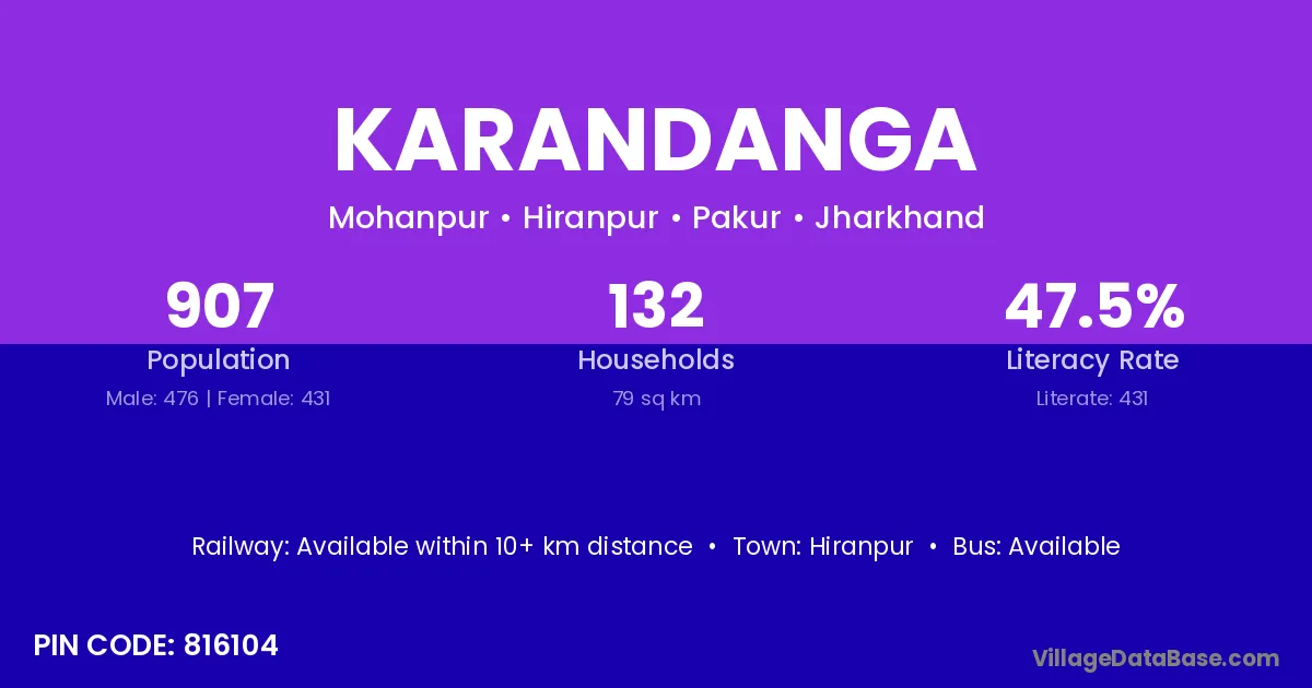 Karandanga village has a total population of 907 people, of which 476 are males and 431 are females.