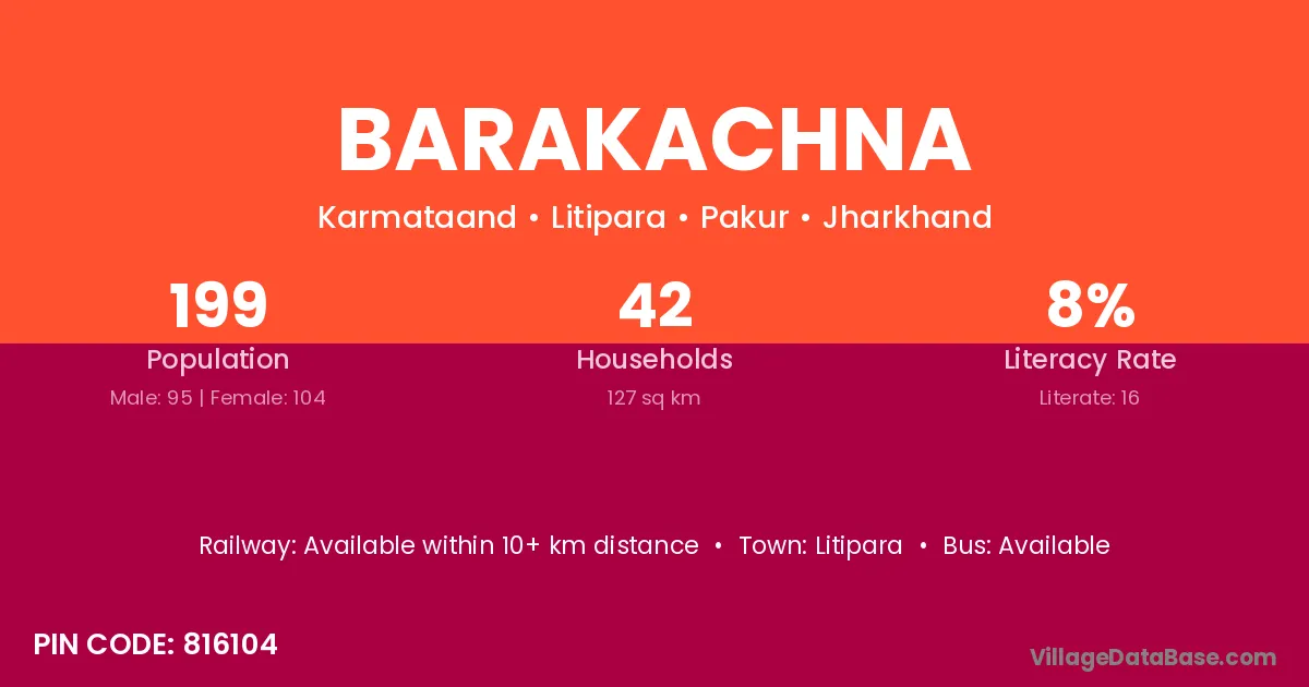 Barakachna village has a total population of 199 people, of which 95 are males and 104 are females.
