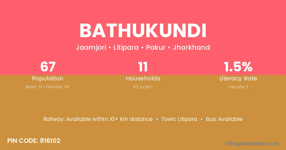Bathukundi village has a total population of 67 people, of which 31 are males and 36 are females.