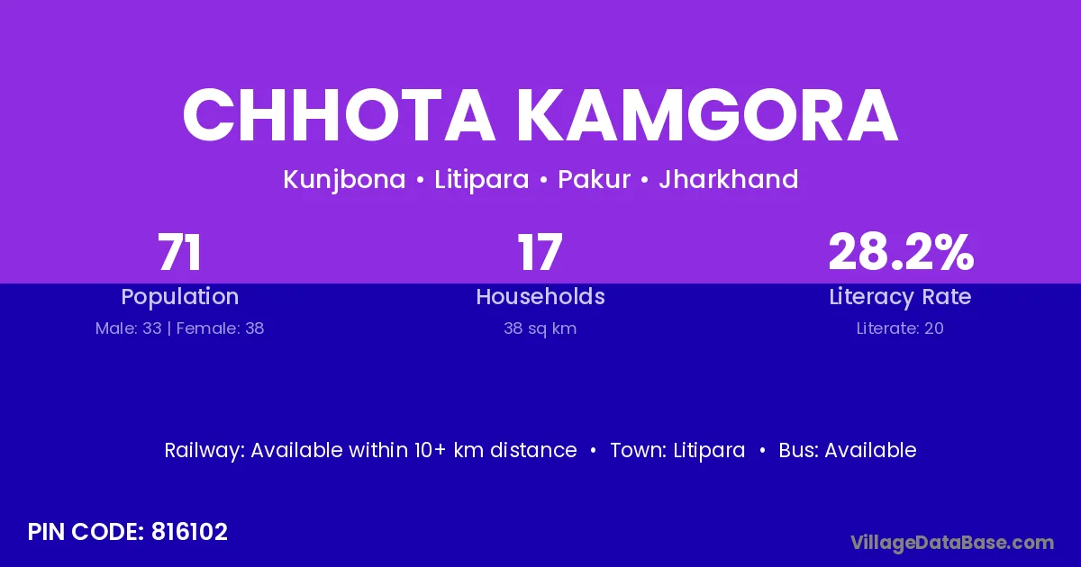 Chhota Kamgora village has a total population of 71 people, of which 33 are males and 38 are females.