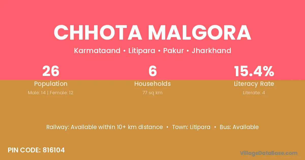 Chhota Malgora village has a total population of 26 people, of which 14 are males and 12 are females.