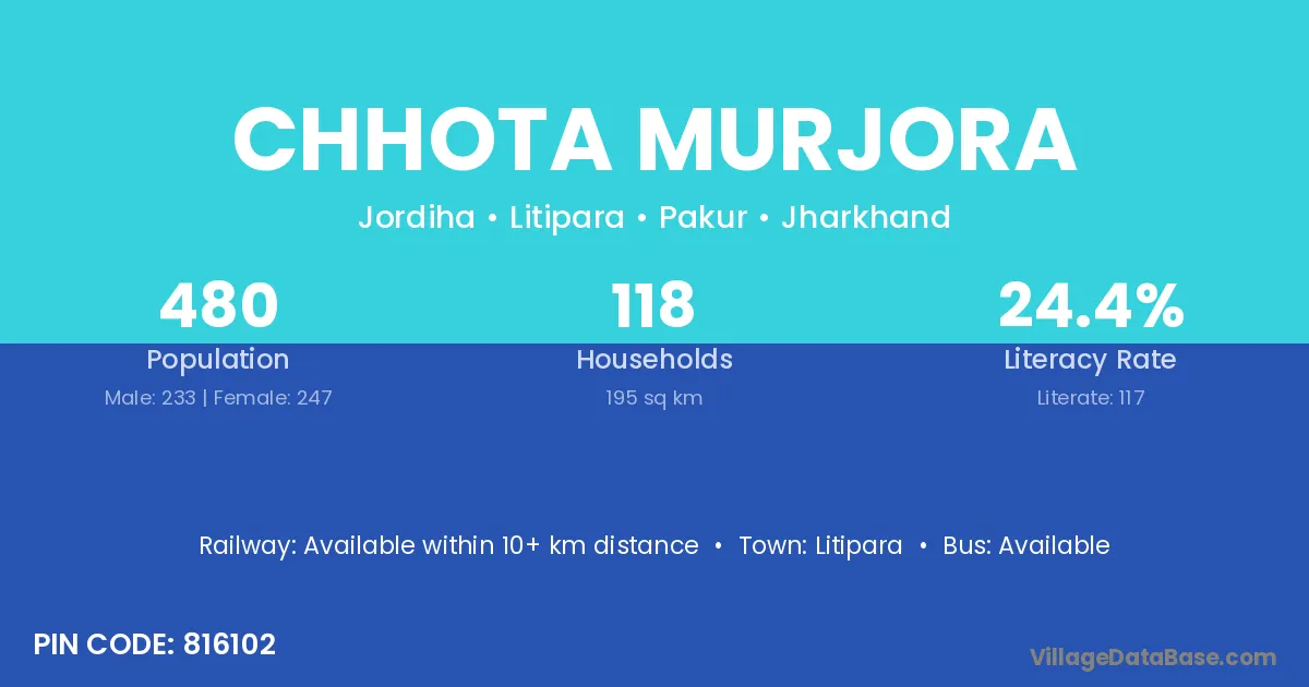 Chhota Murjora village has a total population of 480 people, of which 233 are males and 247 are females.