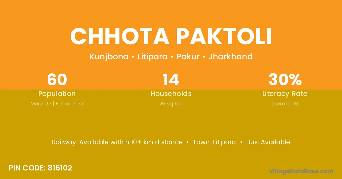 Chhota Paktoli village has a total population of 60 people, of which 27 are males and 33 are females.
