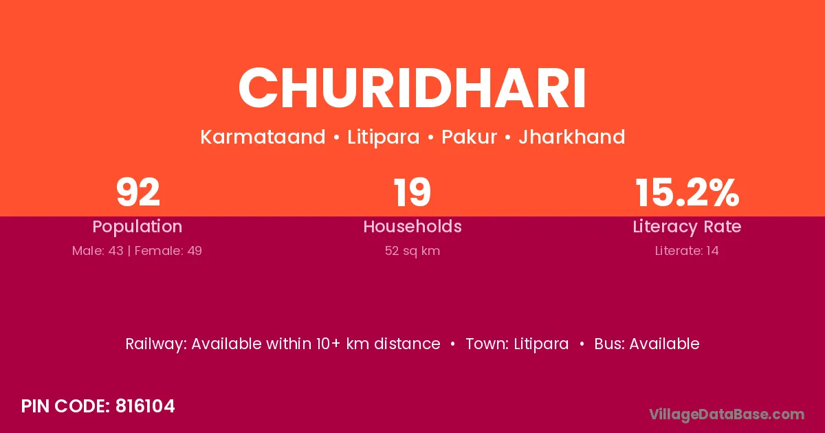 Churidhari village has a total population of 92 people, of which 43 are males and 49 are females.