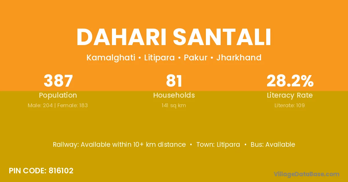 Dahari Santali village has a total population of 387 people, of which 204 are males and 183 are females.