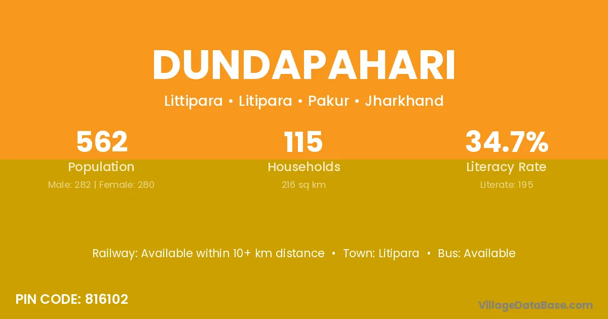 The literacy rate of Dundapahari village is 34.70%. Male literacy stands at 41.84% and female literacy at 27.50%.