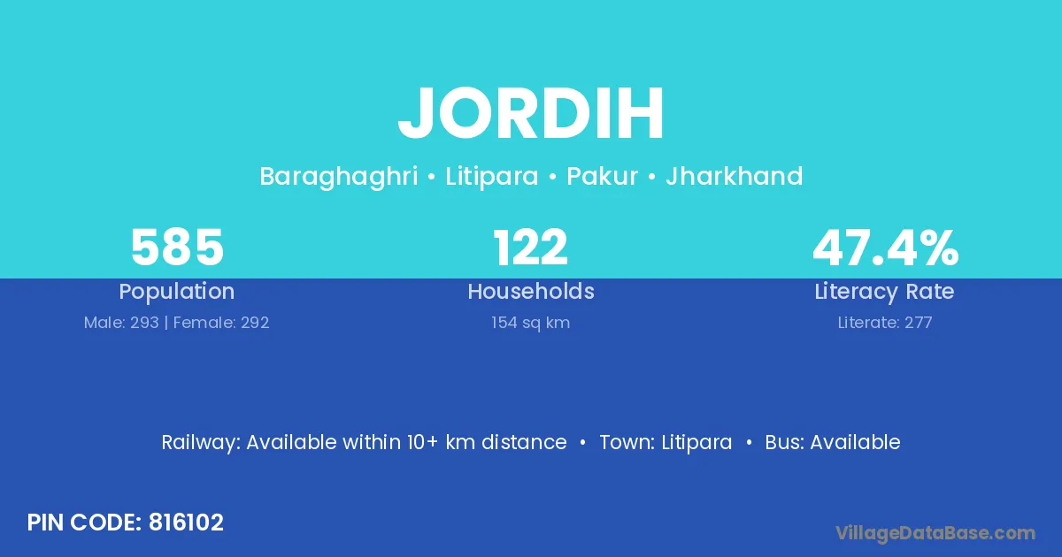 Jordih village has a total population of 585 people, of which 293 are males and 292 are females.