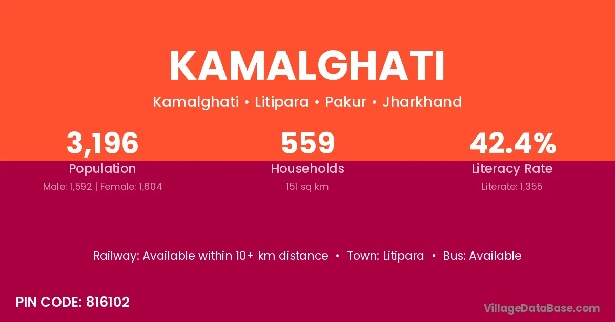 Kamalghati village has a total population of 3,196 people, of which 1,592 are males and 1,604 are females.
