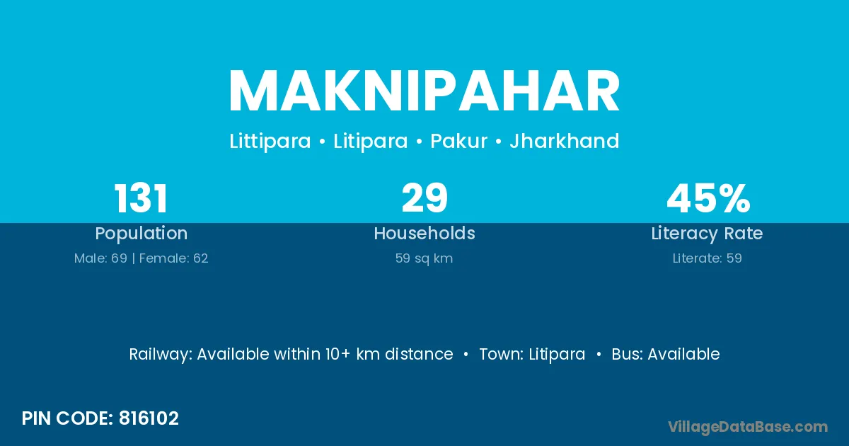 Maknipahar village has a total population of 131 people, of which 69 are males and 62 are females.
