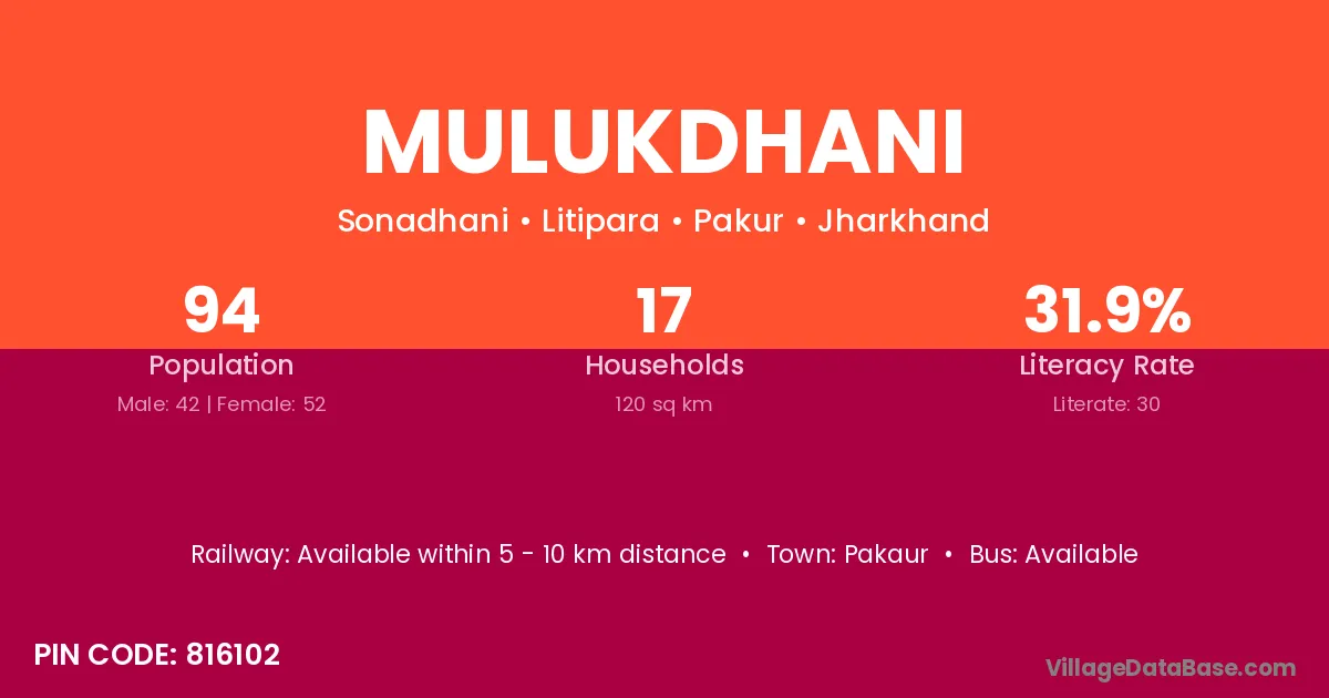 Mulukdhani village has a total population of 94 people, of which 42 are males and 52 are females.