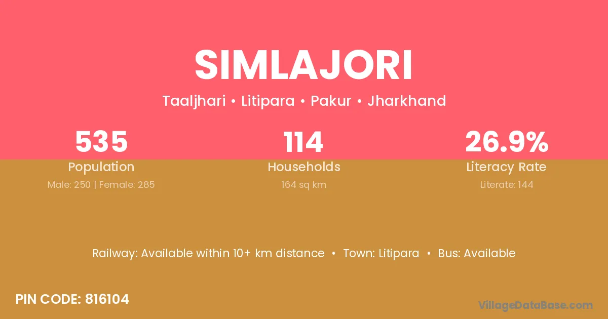Simlajori village has a total population of 535 people, of which 250 are males and 285 are females.