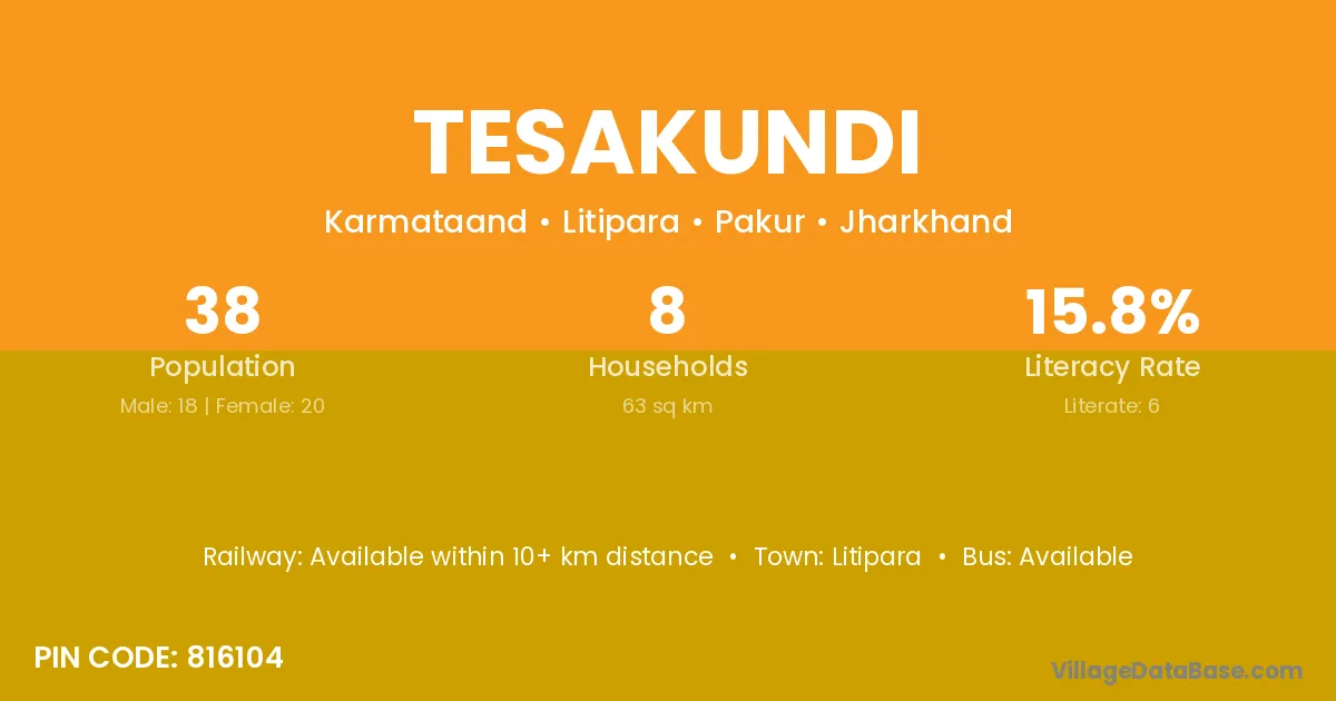 Tesakundi village has a total population of 38 people, of which 18 are males and 20 are females.