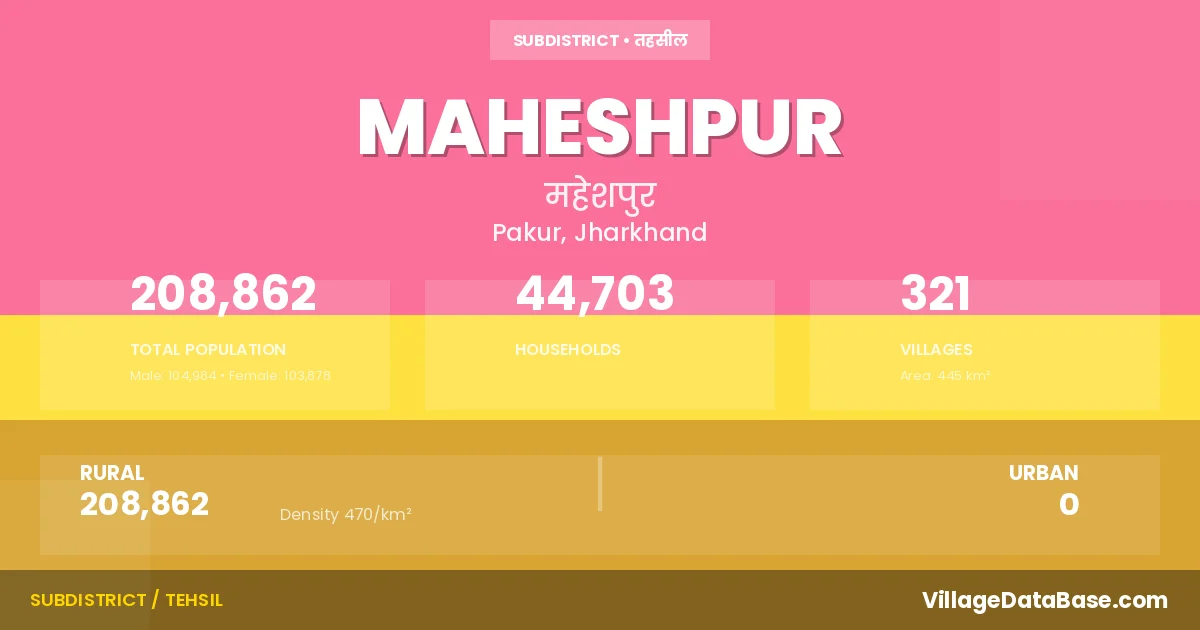 According to the 2011 census The total area of Maheshpur Subdivision is 445 km², with a population of 208862 people. The population density is 470 inhabitants per square kilometre, and there are approximately 44703 houses in the sub district.