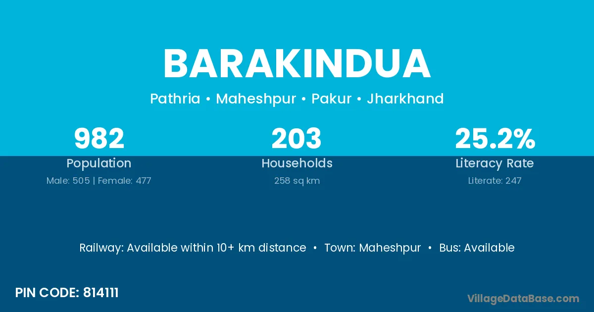 Barakindua village has a total population of 982 people, of which 505 are males and 477 are females.