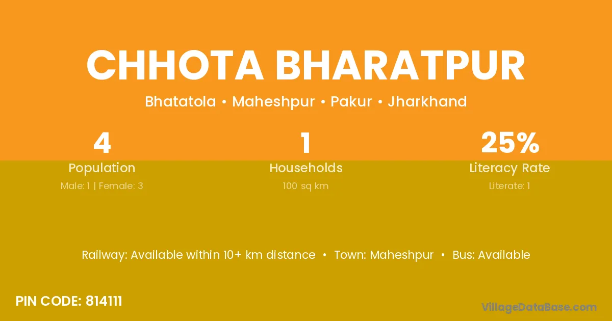 Chhota Bharatpur village has a total population of 4 people, of which 1 are males and 3 are females.