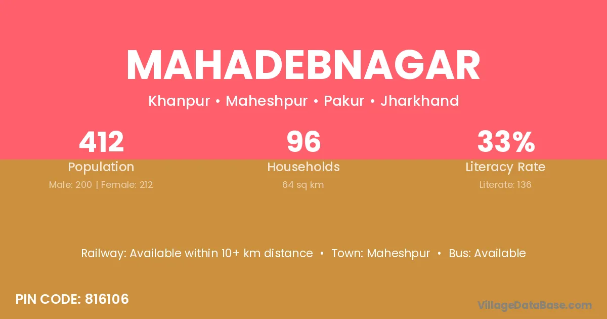 Mahadebnagar village has a total population of 412 people, of which 200 are males and 212 are females.