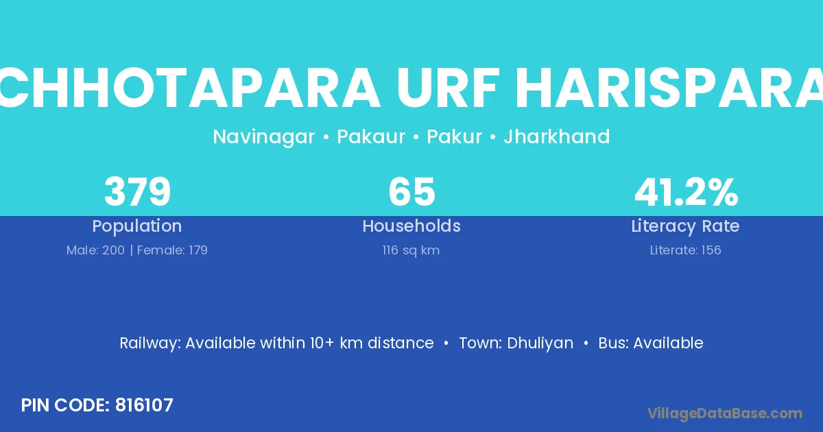 Chhotapara Urf Harispara village has a total population of 379 people, of which 200 are males and 179 are females.