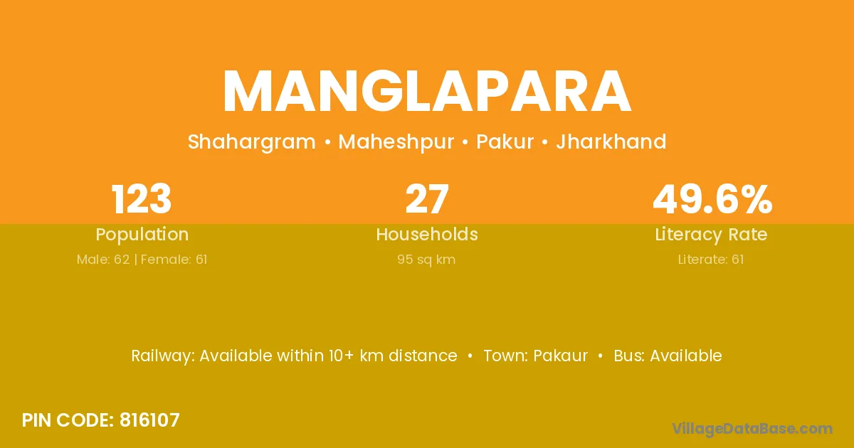 The literacy rate of Manglapara village is 35.84%. Male literacy stands at 44.04% and female literacy at 28.02%.