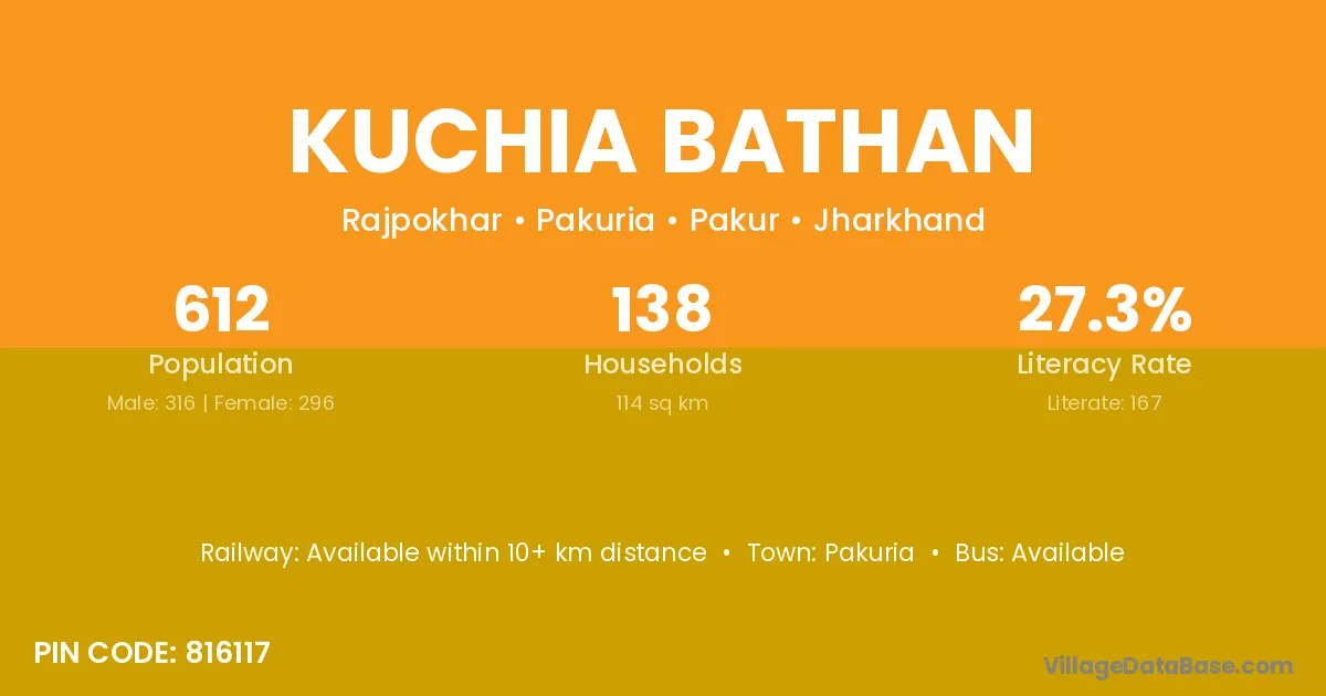 Kuchia Bathan village has a total population of 612 people, of which 316 are males and 296 are females.