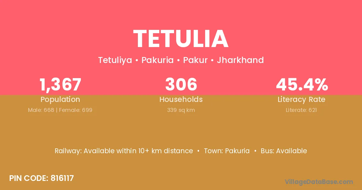 Tetulia village has a total population of 1,367 people, of which 668 are males and 699 are females.