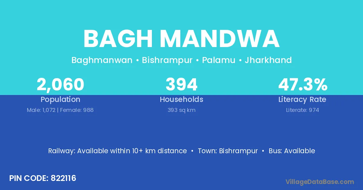 Bagh Mandwa village has a total population of 2,060 people, of which 1,072 are males and 988 are females.