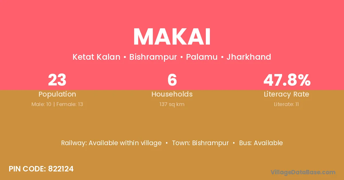 Makai village has a total population of 23 people, of which 10 are males and 13 are females.
