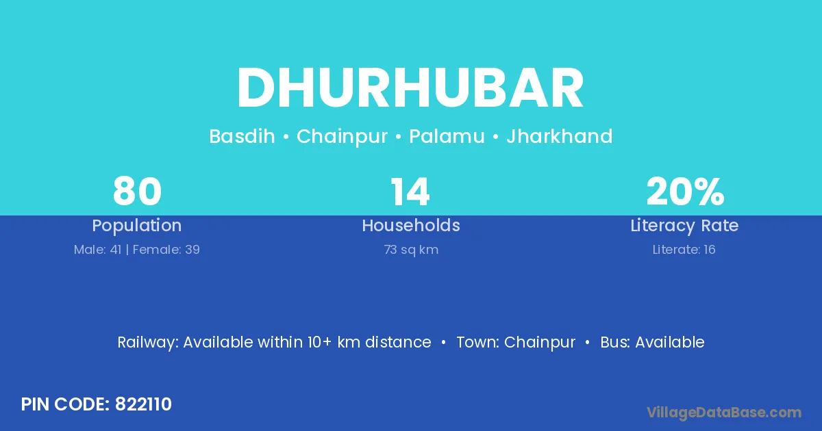 Dhurhubar village has a total population of 80 people, of which 41 are males and 39 are females.