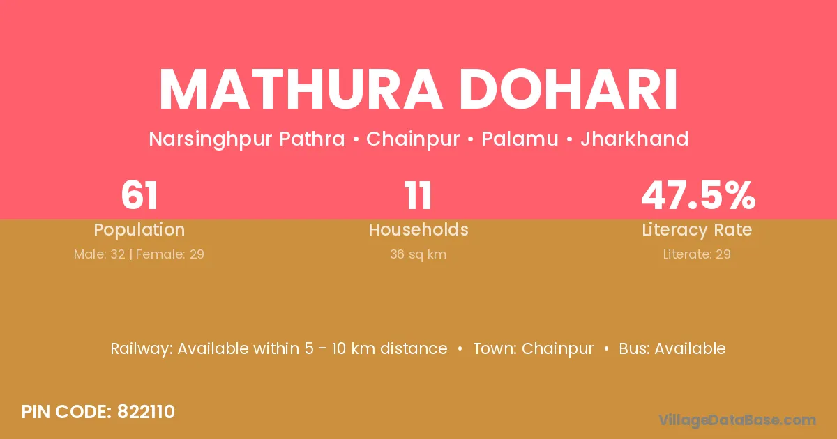 Mathura Dohari village has a total population of 61 people, of which 32 are males and 29 are females.