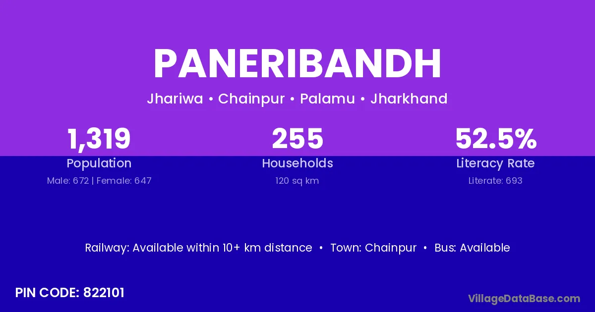 Paneribandh village has a total population of 1,319 people, of which 672 are males and 647 are females.