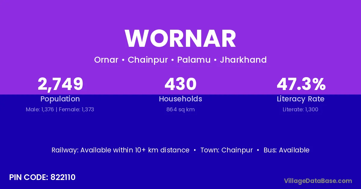 Wornar village has a total population of 2,749 people, of which 1,376 are males and 1,373 are females.