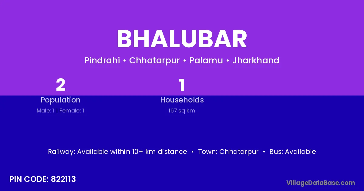 Bhalubar village has a total population of 2 people, of which 1 are males and 1 are females.