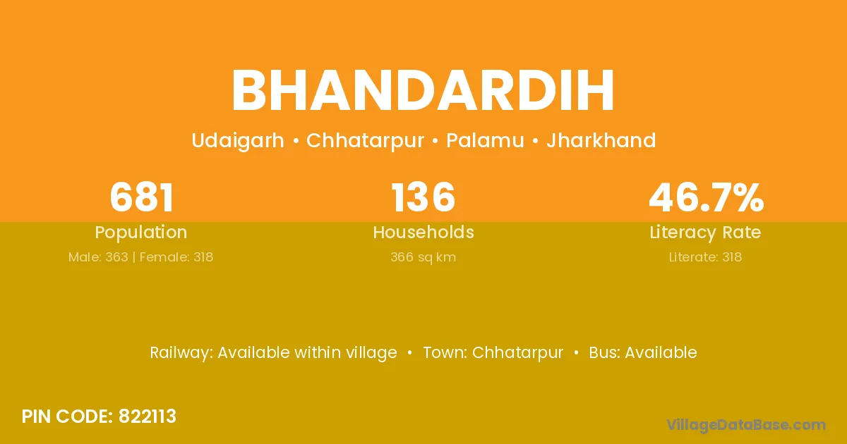 Bhandardih village has a total population of 681 people, of which 363 are males and 318 are females.